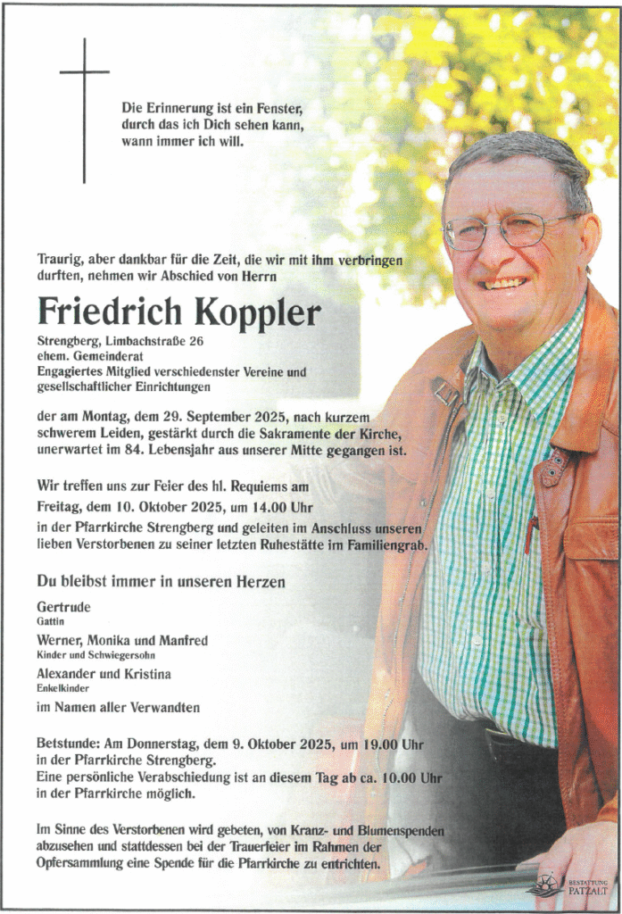 Am 29.09.2025 trat unser sehr geschätztes Feuerwehrmitglied LM Friedrich Koppler seine letzte Reise an. Kamerad Koppler war seit mehr als 65 Jahren (01.03.1960) Mitglied unserer Wehr.
