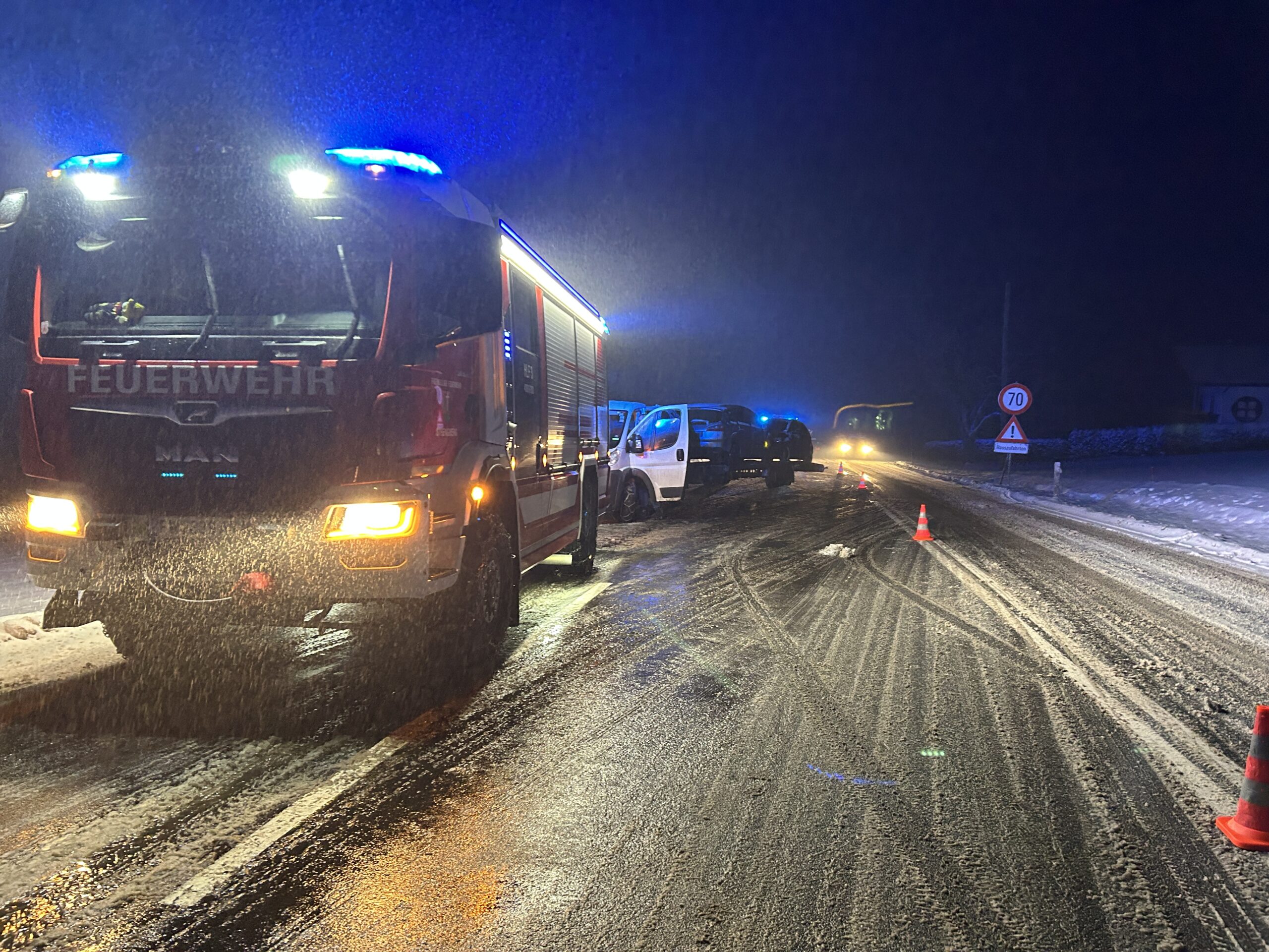 Am 12. Jänner wurden wir um 18:18 Uhr zu einem Einsatz T1 – Bergung Großfahrzeug alarmiert. Ein Autotransporter war aufgrund der winterlichen Witterungsverhältnisse auf der Bundesstraße hängen geblieben und blockierte dabei zwei von drei Fahrstreifen, wodurch es zu einer erheblichen Verkehrsbehinderung kam.