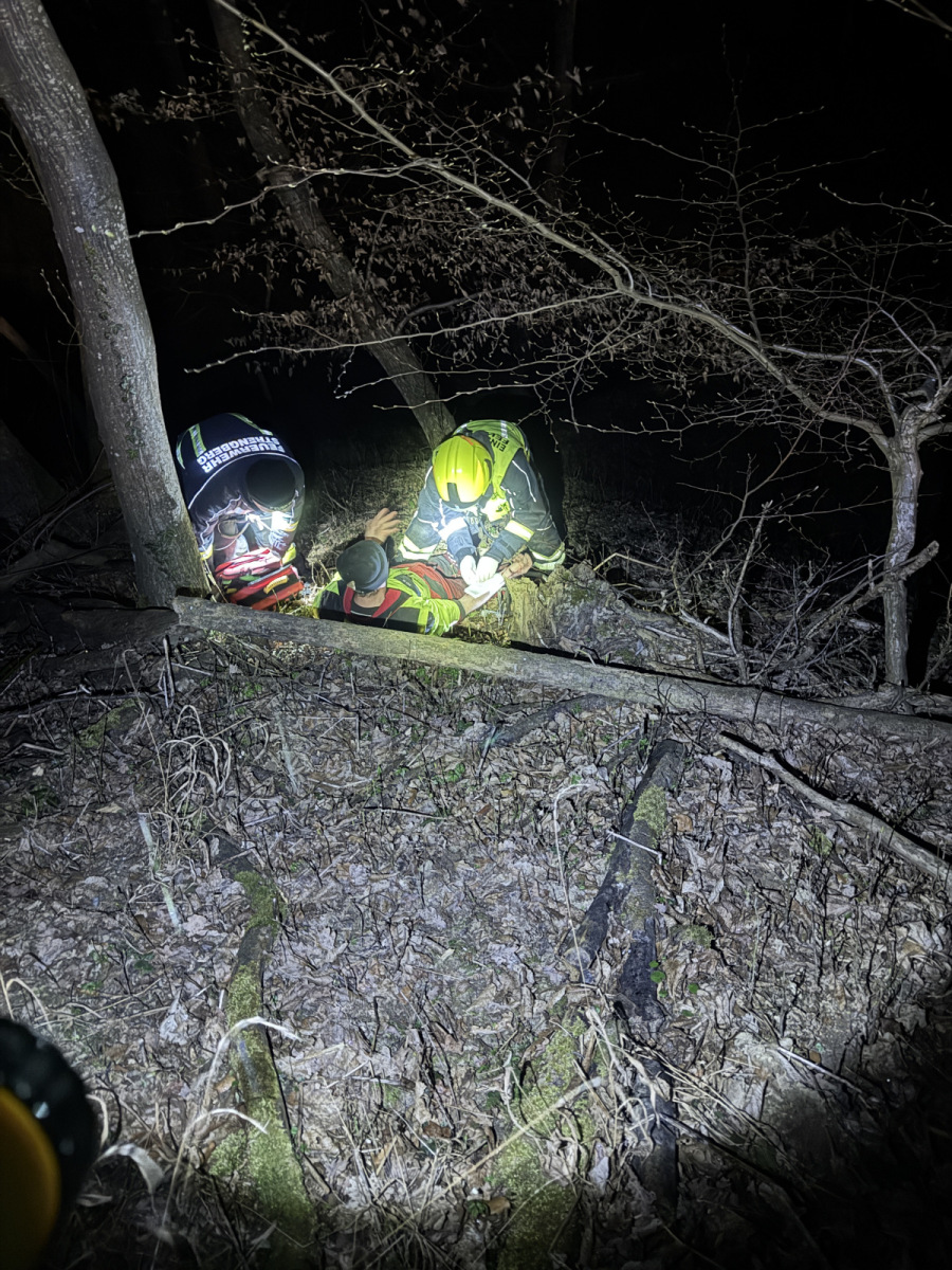 Das Übungsszenario stellte einen Forstunfall mit drei betroffenen Personen dar. Eine Person war bewusstlos, eine weitere erlitt schwere Rückenverletzungen und eine dritte Person galt zunächst als vermisst und war unter einen Baum eingeklemmt.