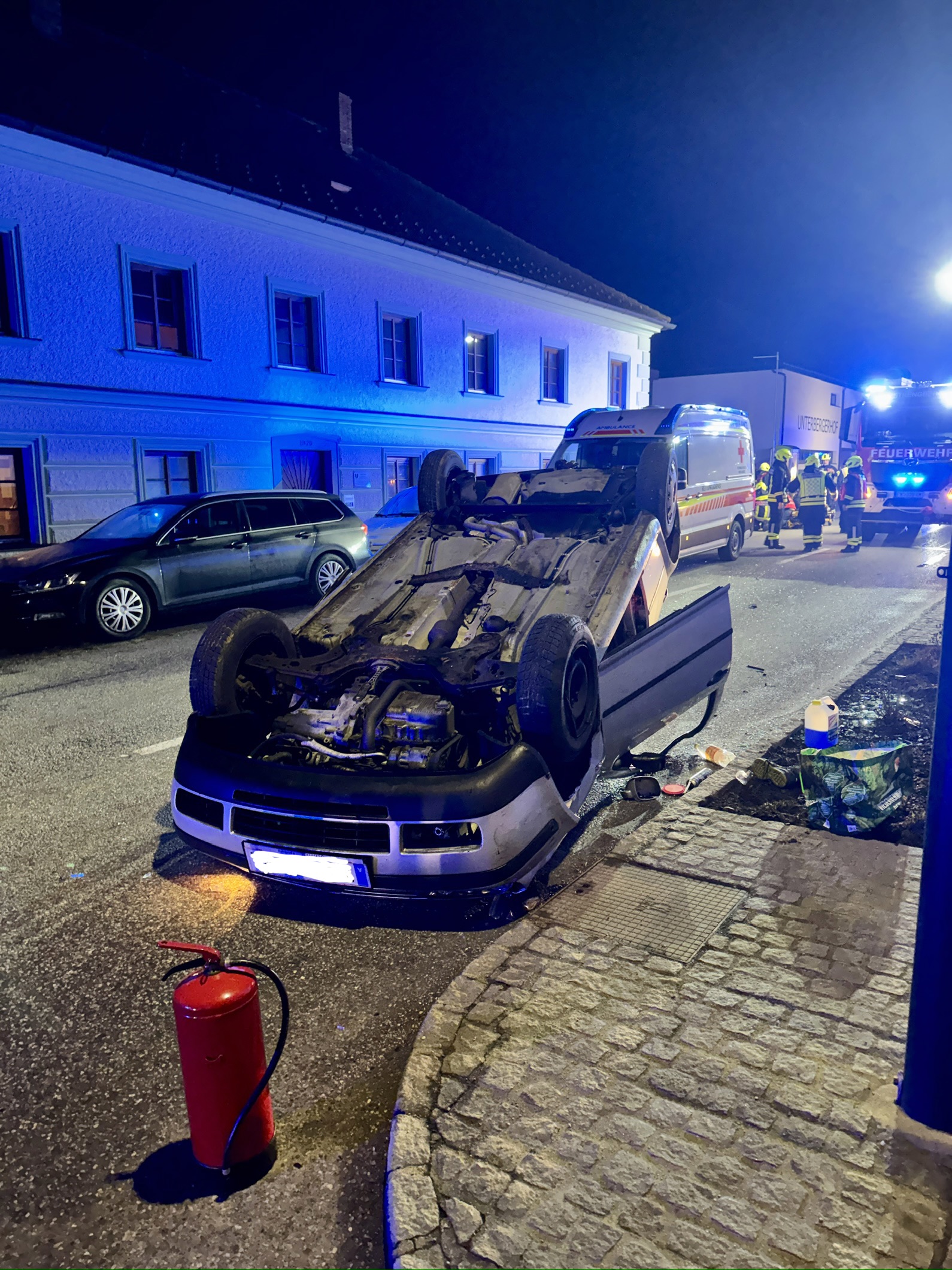 Das Unfallfahrzeug touchierte ein parkendes Auto wodurch es durch die Wucht des Aufpralls zum Überschlag kam. Das Fahrzeug samt Insasse blieb am Dach liegen.